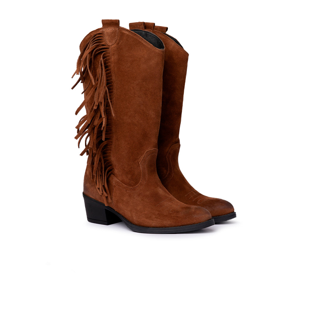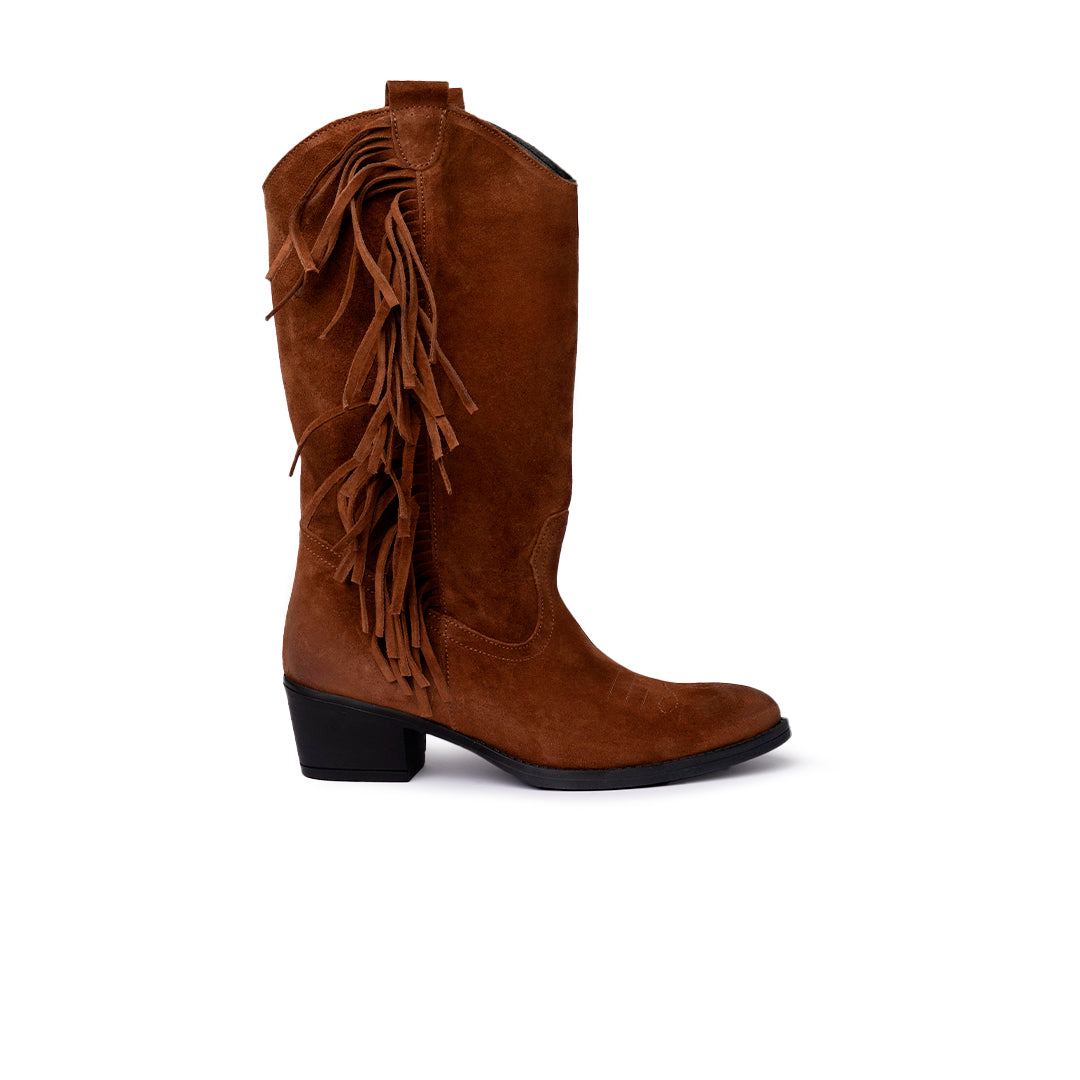 Un classico western rivisitato in chiave contemporanea. Questo stivale in morbido camoscio color cuoio è arricchito da frange laterali che aggiungono movimento e personalità. La silhouette texana con tacco basso e punta affusolata assicura comfort e versatilità, perfetta per valorizzare look casual e outfit quotidiani con un dettaglio deciso.